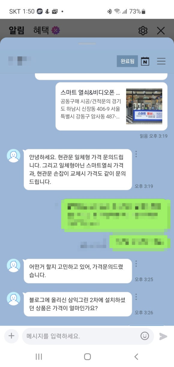 제 블로그에 여러가지 제품 설치 후기들을 보시고 네이버 톡톡 문의를 주셨는데